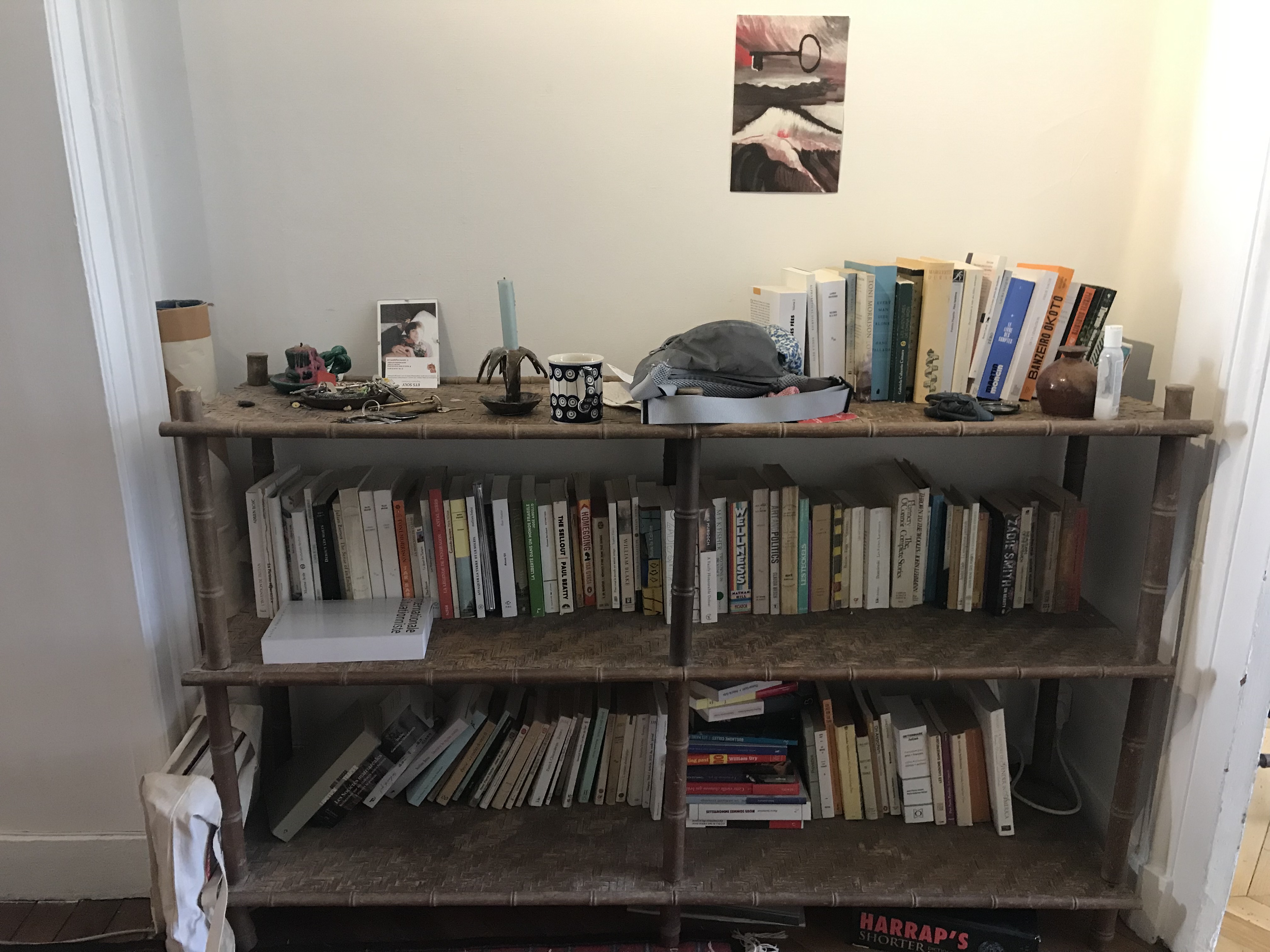 Solía tener un sistema de clasificación muy estricto (novelas francesas en francés, novelas inglesas en inglés, novelas extranjeras traducidas al francés, novelas extranjeras traducidas al inglés, filosofía, teoría política, poesía, libros de arte, fanzines, etc., y todas ellas estaban en orden alfabético dentro de sus subcategorías, por supuesto), pero en los últimos tres años he tenido que mudarme de piso varias veces y he tenido un bebé, así que ya no puedo molestarme más y todo está disperso en numerosas estanterías pequeñas sin ningún orden en particular, y aunque esto me causa un dolor moral considerable, no sé cuándo podré volver a clasificarlas todas.